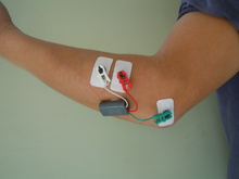 皮膚表面に貼ったセンサから筋電,心電等の各種生体信号を計測,表示,解析する。(無線タイプ)